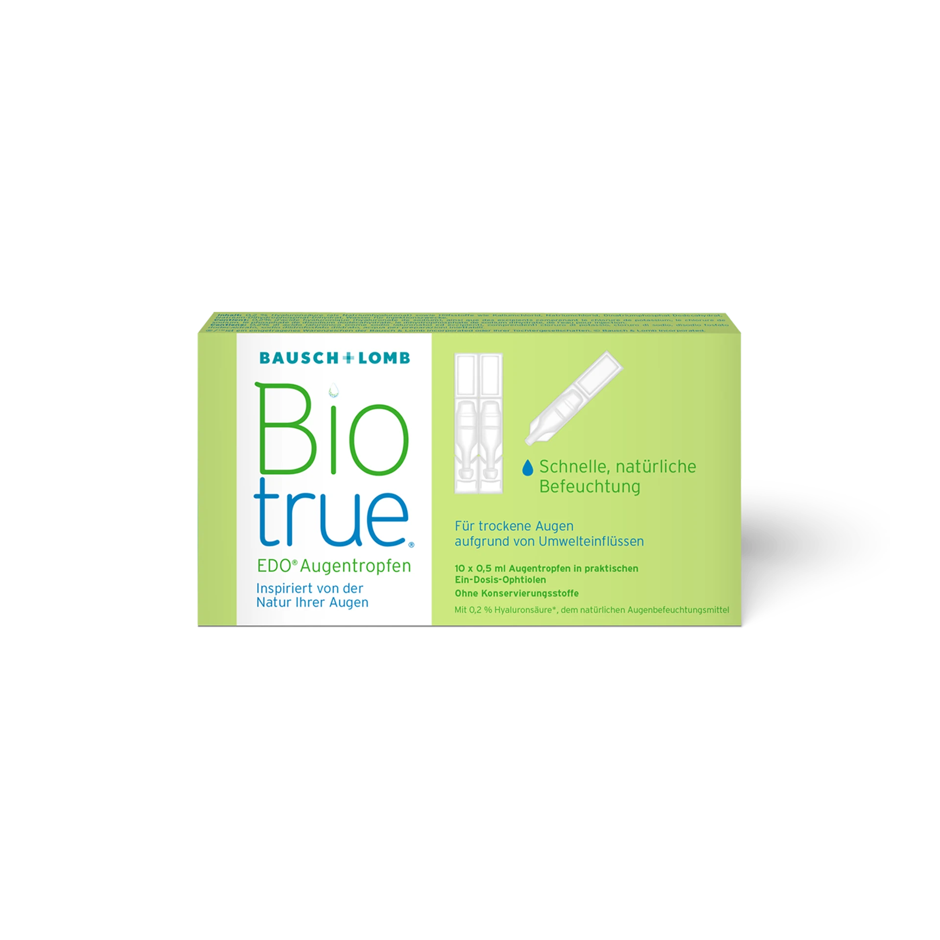 Die Ein-Dosis-Ophtiolen (EDO) sind besonders praktisch für unterwegs und damit der ideale Begleiter, z. B. auf Reisen, im Büro und in der Freizeit. Biotrue Augentropfen EDO enthalten 0,2 % Hyaluronsäure und sind unkonserviert.