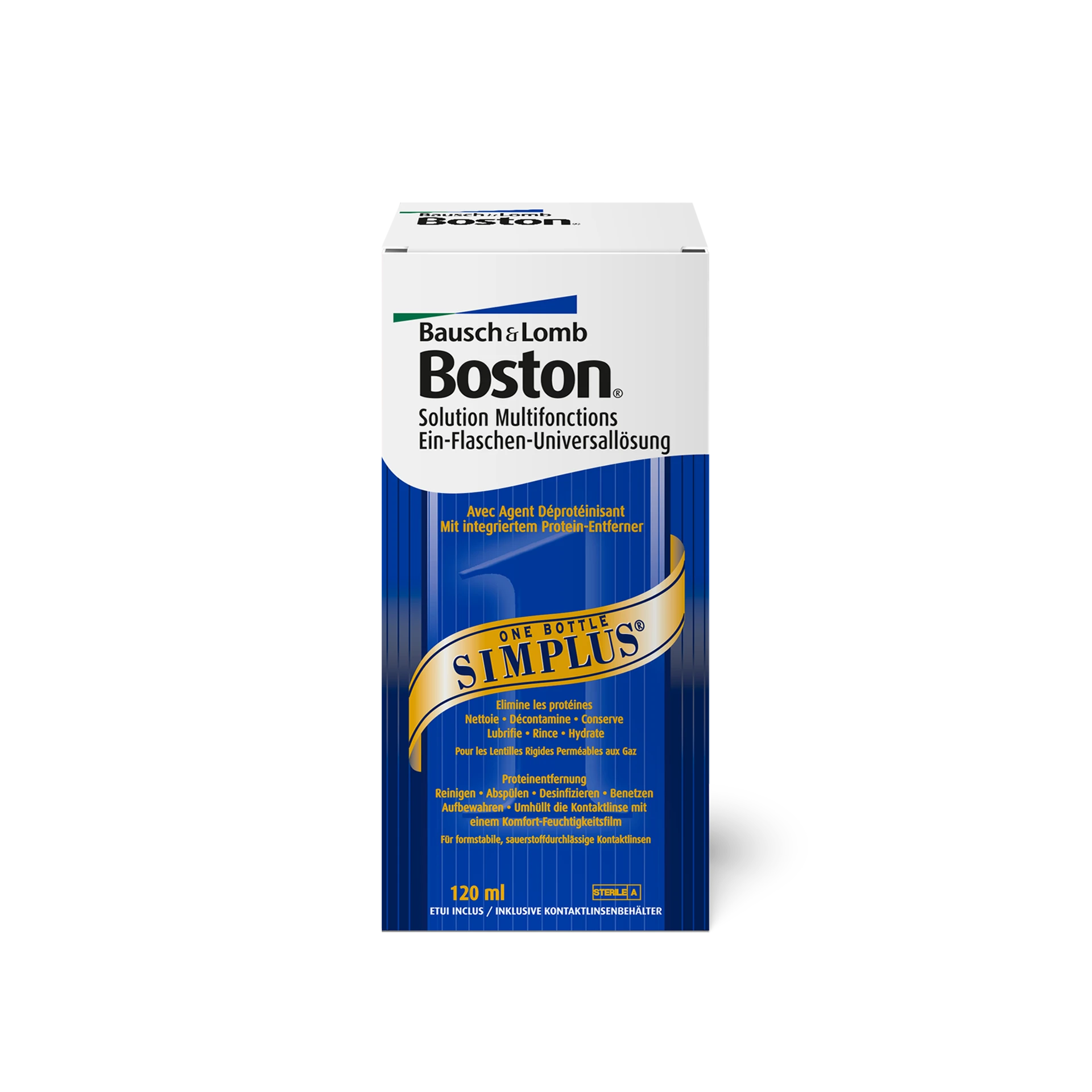 Boston SIMPLUS - das praktische Ein-Flaschen System mit der Kraft eines Zwei-Flaschen Systems. Das All-in-one Pflegemittel für alle harten (formstabilen) Kontaktlinsen reinigt, desinfiziert und entfernt Proteine, so dass abendliches Abreiben nicht mehr nötig ist.